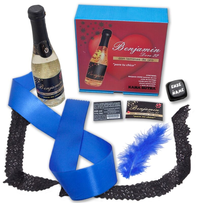 ESTUCHE con un BENJAMIN DORE CON LAMINAS DE ORO DE 22 KILATES de carácter afrutado, fresco y joven, compuesto por un vino espumoso muy selecto CON LAMINAS DE ORO de 22 KILATES PARA TU CHICO.