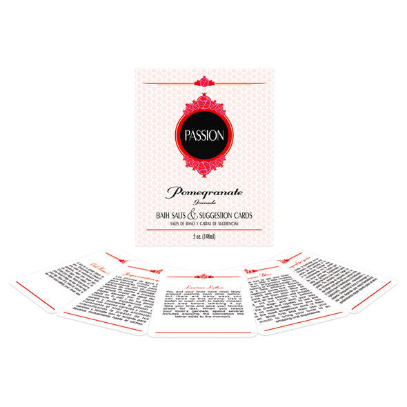 145 gramos de sales de baño con aroma de granada ( para 5 baños ) y 5 cartas de Passion (resistente al agua)