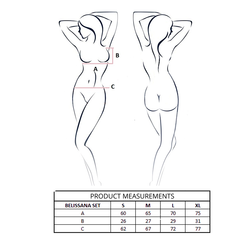 El conjunto BELISSANA combina sensualidad y elegancia moderna, diseñado para mujeres que aprecian la belleza sutil y el lujo en cada detalle. Elaborado íntegramente en delicada poliamida transparente, cautiva con su ligereza y delicadeza, a la vez que realza la belleza natural del cuerpo.