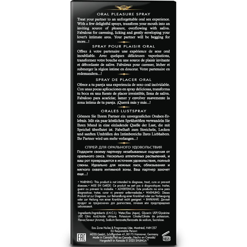 Descubre una nueva forma de disfrutar el juego oral con este spray diseñado para elevar la experiencia a otro nivel. Con solo unas pulverizaciones, tu boca adquiere una textura más suave y húmeda, perfecta para deslizarse con sensualidad por cada rincón íntimo de tu pareja. Sus deliciosos sabores despiertan los sentidos y convierten cada beso, cada lamida y cada roce en un estímulo irresistible que aumenta el deseo de manera natural.